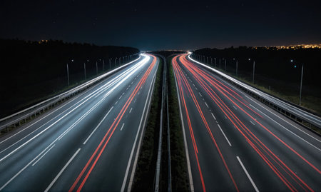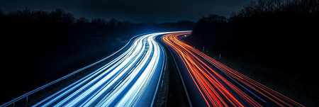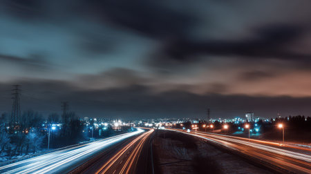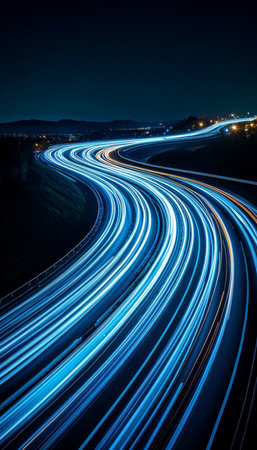 Captivating long exposure photograph capturing vibrant light trails of traffic on an urban highway at night, showcasing movement and energy in city life.