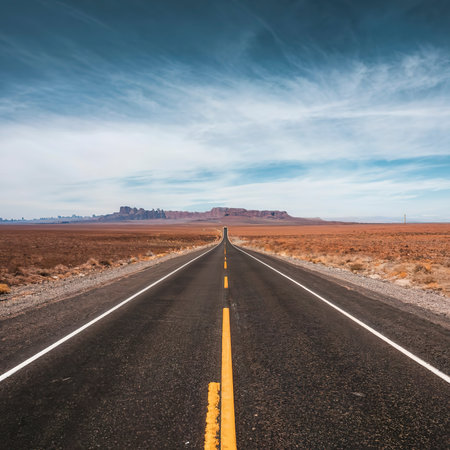 Natural american landscape with asphalt way to horizon. Panoramic picture of a scenic road, USA. Endless straight, Route 66.