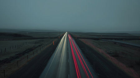 The lonely highway is enlivened by a blur of red and white car light trails a reminder of life once bustling through this deserted area