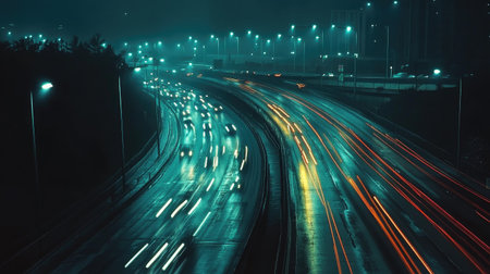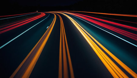 An AI generated illustration of a long exposure photograph of light trails created by vehicles