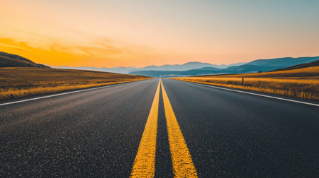 Scenic open road stretching into the horizon during sunset with vibrant skies and distant mountains, perfect for travel and adventure themes