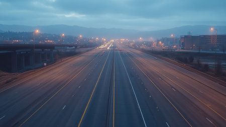 A serene view of an empty highway at dusk, illuminated by soft city lights and distant mountains. Perfect for themes of solitude and travel.