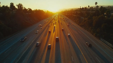 A vibrant sunset illuminates a busy highway filled with vehicles. The scene captures the essence of urban travel, showcasing the blend of nature and infrastructure.