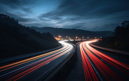 Winding Highway with Streaks of Red and White Headlights at Night Automotive Long Exposure