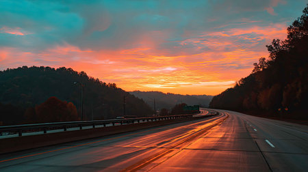 This stunning image captures a picturesque highway bathed in vibrant colors during sunset. The road reflects the hues of the sky, creating a serene travel experience.