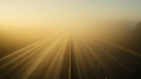 An enchanting view of a fog-covered highway at dawn. The soft light creates a serene atmosphere, inviting travelers to explore the mysterious road ahead.