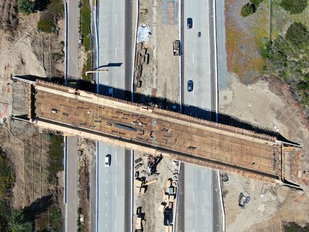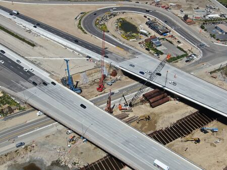 Aerial view of bridge construction crossing the highway, California, USA