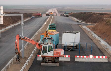 Road construction equipment are working on a new road construction repair route extension