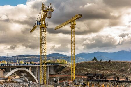 Cranes and tower cranes at the construction site of an elevated road, or elevated bridge. sky background.