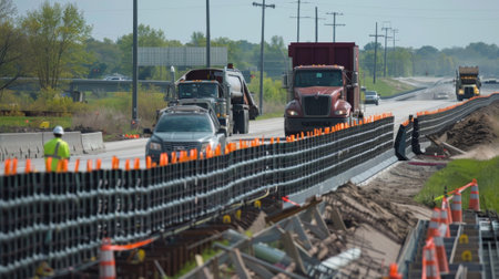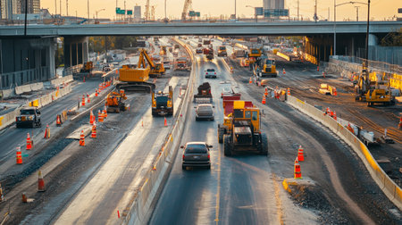 An expressway under construction, featuring machinery, construction barriers, and workers, showing the development and maintenance of major roadways.
