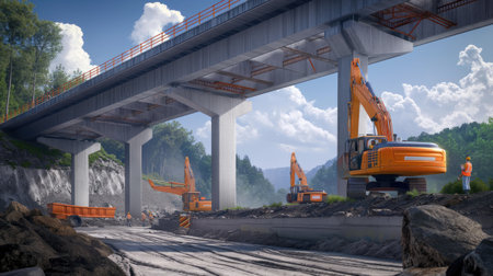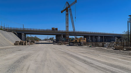 An expressway under construction with cranes, machinery, and construction barriers, depicting the development and maintenance of critical transportation routes.
