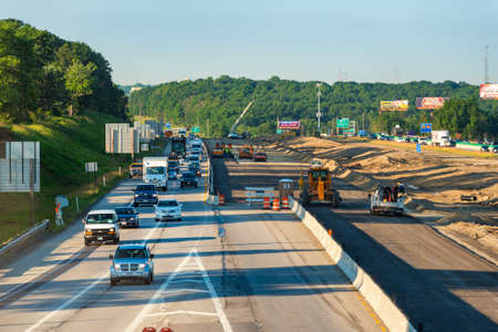 BEDFORD HEIGHTS, OH - JUNE 28, 2017: Major road construction on I-271 near Cleveland has morning rush hour traffic moving slow.