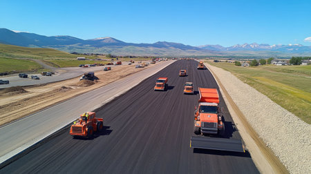 Aerial view of a construction site where trucks lay asphalt on a new roadway. Machinery and vehicles work efficiently in clear daylight, showcasing infrastructure development.