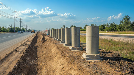 A clear view of ongoing highway construction showing concrete pillars lined along the roadside, surrounded by dirt and greenery under a bright, cloudy sky.