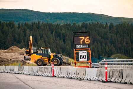 Radar Speed Sign displays vehicle speed on variable sign, your speed is 76, 80km maximum limitation, road work zone Machines Excavators on background