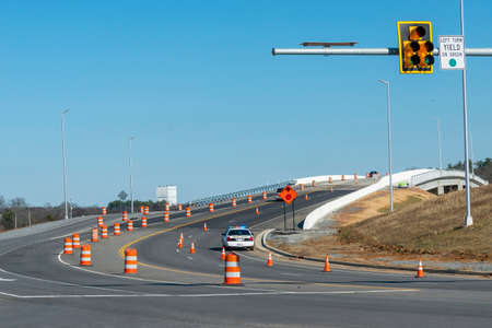 Industrial roadworks. Roundabout on wide American highway under construction. Development of transportation system for rapid transit