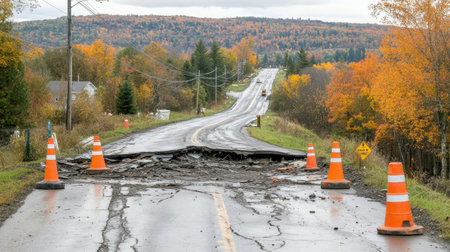 An empty country road shows significant damage from flooding, with construction cones marking the hazard. The surrounding autumn foliage features vivid oranges and yellows, enhancing the scene.