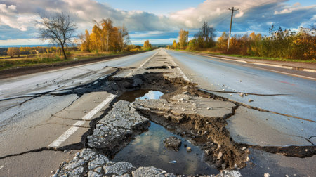 AI Generated. Damaged asphalt road with potholes and erosion after a flood