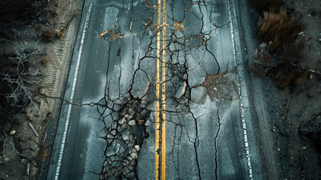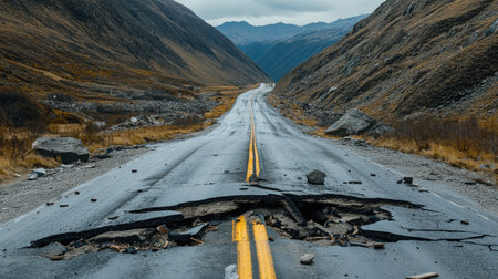 A striking image of a cracked asphalt road in a mountain valley, showcasing the aftermath of a natural disaster with rocky terrain and a cloudy sky.