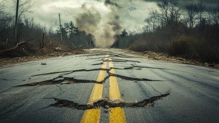 A dramatic scene features a cracked road leading to dark clouds and smoke, highlighting the impact of natural disasters on the environment and landscape.