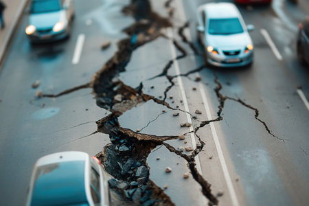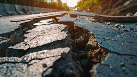 A close-up view of a cracked road surface illustrating the impact of natural disaster, with faded vehicles and a blurred forest backdrop, symbolizing environmental changes.
