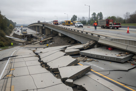 A highway bridge has collapsed, causing significant damage to the road below. Emergency crews are on the scene.