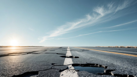 AI Generated. Cracked asphalt road surface with vehicles in the background during sunset light Copy Space
