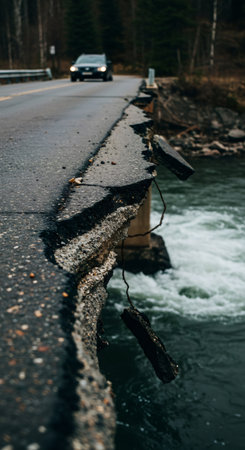 Dangerous broken asphalt road edge over a raging river. Disaster and natural flood eroding bridge infrastructure.
