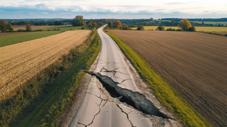 A rural road with a large, uneven crack that disrupts the otherwise smooth surface, surrounded by farmlands