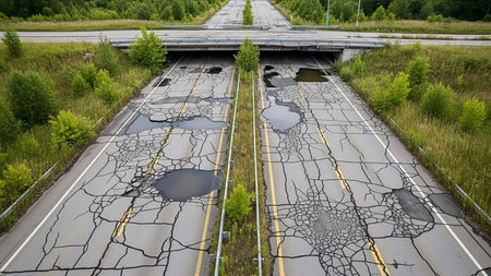 An aerial perspective shows a highway overtaken by plant life. The asphalt road surface is cracked and aged with bushes growing in the center. The composition is symmetrical with light poles present. It could be used in projects focusing on environmental change or post-apocalyptic themes.