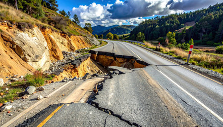Cracked asphalt road surrounded by landslide debris, with a dramatic cloudy sky and mountains in the background, showcasing natures power