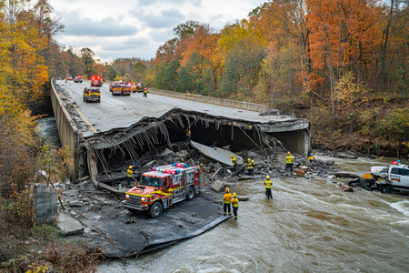 Amid vibrant autumn colors, emergency teams work tirelessly to manage a bridge collapse over a rushing river. Fire trucks and personnel coordinate rescue efforts in a challenging environment.