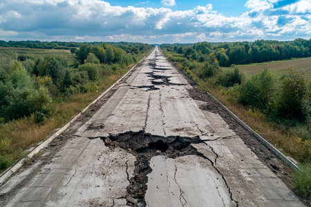 A once smooth highway now bears deep cracks and fissures, surrounded by lush greenery under a bright blue sky.