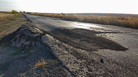 Damaged road. Dangerous road. Asphalt was made of poor materials and poor quality. Mobile photo.