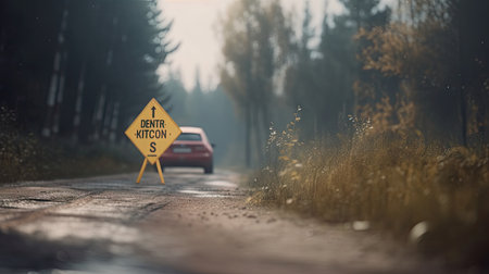 A scene showcasing road damage from a landslide in a tranquil forest area, featuring a warning sign. The clutter of debris highlights the need for caution in natural travel locations.
