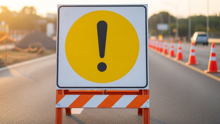 Close up of sign of road work on background of blue sky with white clouds. Information for traffic participants about carrying out repairs on road. Concept of careful and attentive driving