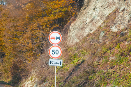 Yellow speed limit sign on a background of green trees. Thailand. Phuket