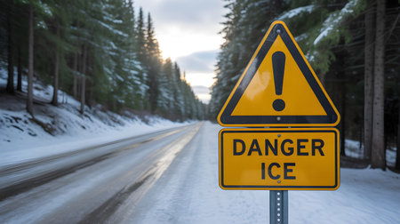 Yellow warning sign indicating danger ice on a snow covered road through a forest