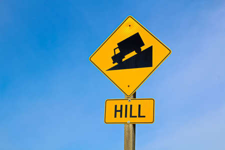 Approaching hill sign along highway.