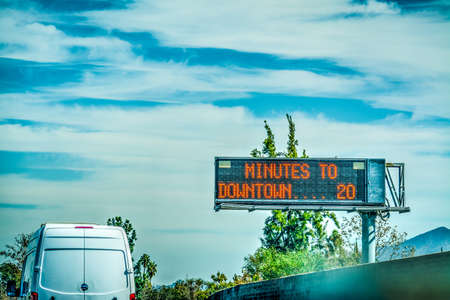 Minutes to downtown road sign in a Los Angeles freeway. California, USA