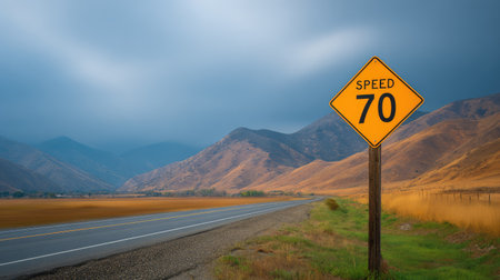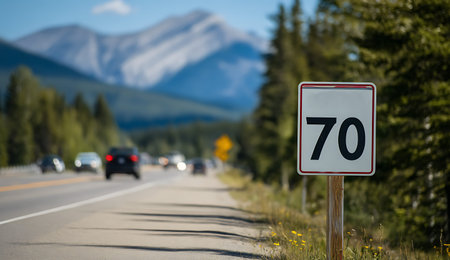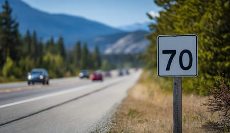 A speed limit sign indicating 70 is positioned on the side of a highway that winds through a mountainous region. Cars are visible on the road in the background, moving away from the viewer. The surrounding area is characterized by dense evergreen trees and distant, majestic mountains. The sunlight illuminates the scene, creating a sense of open space and travel.