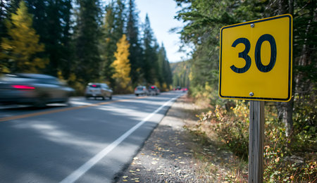 A bright yellow square sign indicating a speed limit of 30 is placed next to a road. The road is bordered by trees, some displaying autumn colors, and several cars are visible in motion, blurred to convey speed. The scene is set in a natural environment, likely a forest road.