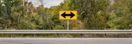 Double arrow traffic sign at the end of a road with a forest in fall colors