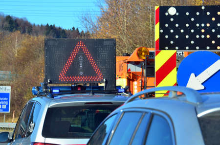 Illinois highway, USA. May 8, 2019: Warning road sign billboard for stopped vehicles and speed limits on a highway, cloudy sky