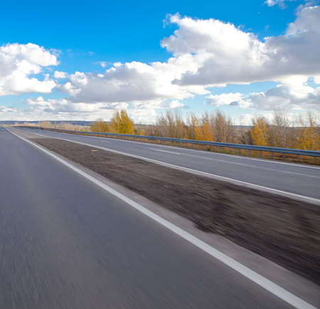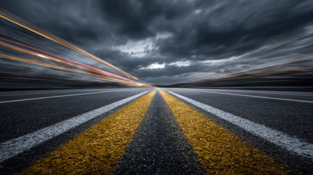 Captivating view of a highway stretching into a cloudy sky, showcasing dynamic motion effects and striking yellow road markings offering an engaging travel perspective.