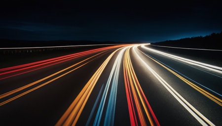 Captivating nighttime long exposure photograph capturing vibrant light trails from vehicles on a busy highway, illustrating dynamic motion and urban energy.