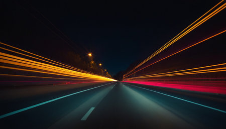 Nighttime highway lights create dynamic streaks of color in a long exposure shot, showcasing fast-moving vehicles along the road