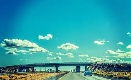 Scenic landscape with exit road sign and Overpass on mountain highway. Side view to tract in highlands. Beautiful scenery with asphalt road with road markings