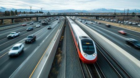 A high-speed train racing alongside a highway, contrasting with slower-moving cars and trucks in the adjacent lane.