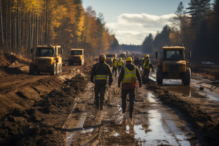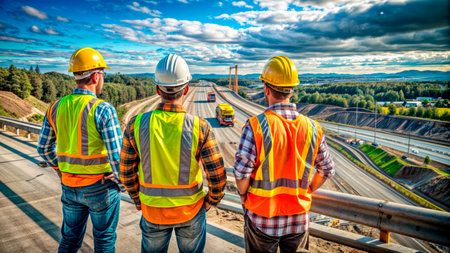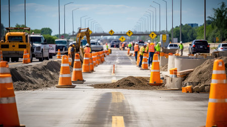 Road Expansion: Highway construction, workers, and heavy machinery in action